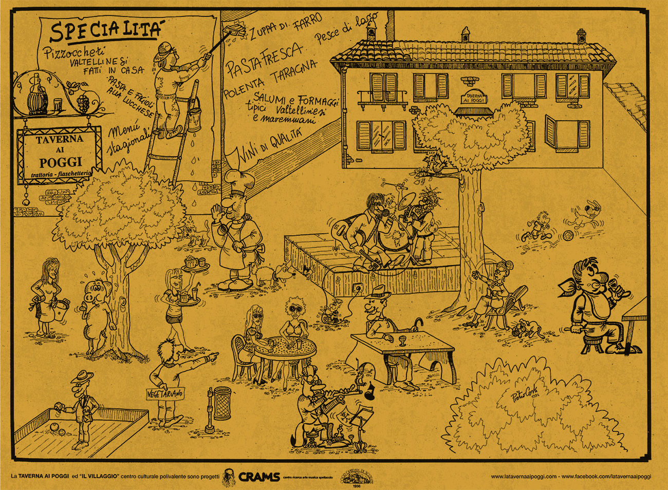 La storica tovaglietta realizzata nel 1991 da Pietro Corti è ancora attualissima e caratterizzante della Taverna oltre che essere amata da adulti e piccini per essere collezionata e colorata